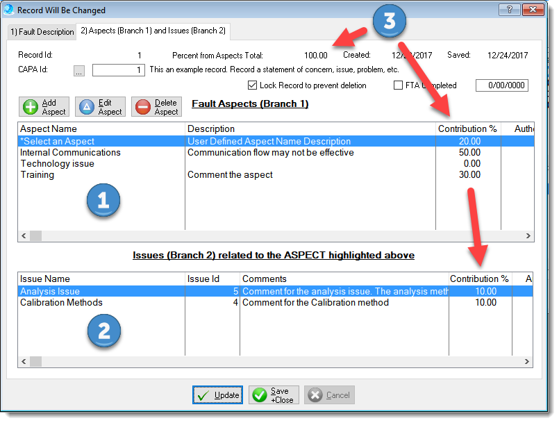 1)The [Add Analysis from Template] button opens the Fault Tree Template module. The upper section of window table shows the link to the CAPA and Fault Template records. 2)The Fault Tree Analysis form contains two tabs ... a.Fault Description b.Aspects and Issues 3)A CAPA Id may be assigned and selected from a lookup table of active Corrective Actions. 4)The Fault Tree Analysis contains a.The ASPECTS (Branch 1) of the Fault Tree b.The ISSUES (Branch 2) related to each ASPECT 5)Once the Fault Analysis has been completed and a root cause can be determined the Fault Analysis can be locked and marked completed to prevent any unwanted changes.