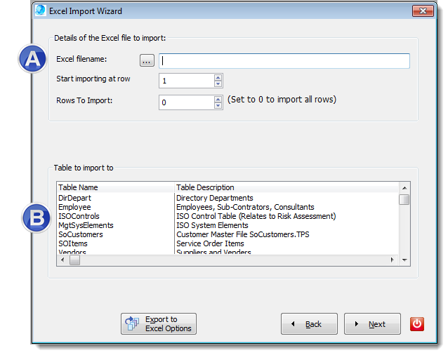 A.In the image below, the details of the Excel file to be imported are needed to proceed. Enter the Excel file name and path or use the [...] navigation button to locate the file. The 'Start importing at row' may be used to skip a header row that may exist in the Excel file. The 'Rows to Import' may be used to limit the import to a specific quantity of rows or records in the Excel file; set to zero (0) to import all rows).